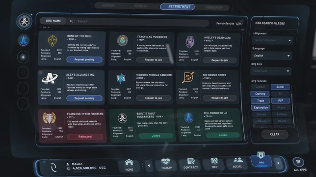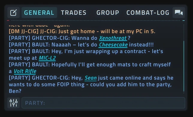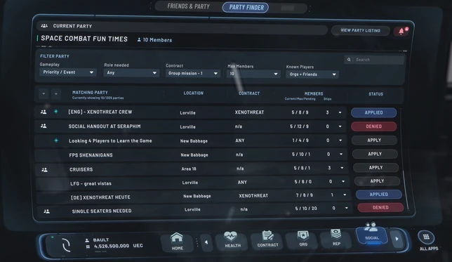 Un système de recherche de groupe est en travaux. On peut y définir des gameplays, des contrats ciblés, un nombre de joueurs, des rôles recherchés, etc. De même on peut filtrer l’affichage pour ne trouver des groupes liés qu’à ce que l’on souhaite jouer.