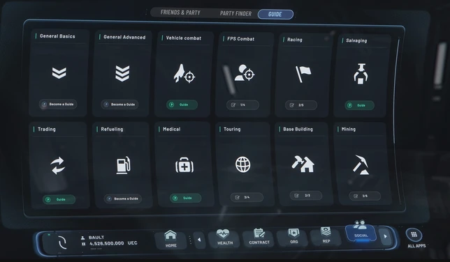 Un écran de guide sera disponible dans le mobiglas. Il faudra désormais remplir des conditions en jeu pour prétendre à guider les nouveaux joueurs. Les guides seront récompensés pour encourager les experts à accompagner les nouveaux joueurs. Les nouveaux joueurs peuvent vérifier la fiabilité d’un guide, et demander des guides pour une gameplay en particulier, à la manière des beacons de services déjà existants.