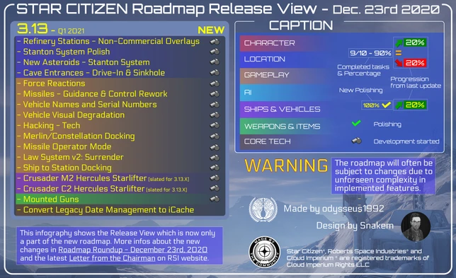 Le 23 décembre 2020, CIG a publié la nouvelle feuille de route de Star Citizen et Squadron 42. Celle-ci est désormais composée de deux affichages, celui du suivi des progrès et celui des sorties. Le premier (Progress Tracker) nous indique ce sur quoi les équipes au sein du studio travaillent en ce moment et ce sur quoi elles prévoient de travailler dans les prochains trimestres. À l’heure où est publié cet article, seules 20 équipes sur les 50 prévues y sont présentées. Cette partie ne sera pas le sujet principal de cette chronique mais le sera dans un hors-série qui sera disponible plus tard, lorsque toutes les 50 équipes du studio seront présentes. L’affichage des sorties (Release View) est dans la continuité de l’ancien format et nous dévoile les fonctionnalités prévues pour être disponible dans les prochaines mises à jour trimestrielles de Star Citizen. Pour le moment, seule la colonne de la 3.13 a été dévoilée, et c’est ce sur quoi nous allons nous concentrer aujourd’hui.