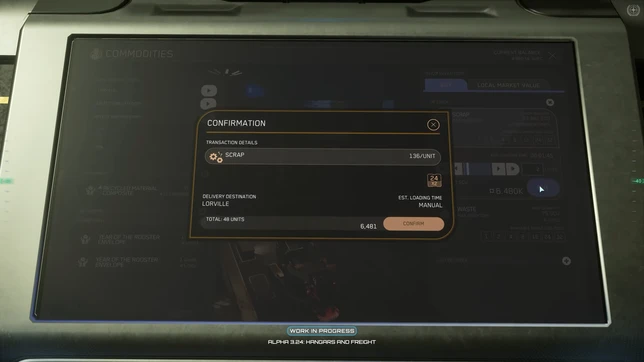 Quand un joueur achète des marchandises dans un lieu où il a un vaisseau stocké (c'est-à-dire qui n’est pas sorti dans un hangar ou posé à proximité), il peut choisir de les placer dans l’inventaire du lieu ou dans son vaisseau. Cette dernière option est plus coûteuse. De manière similaire, quand un joueur veut vendre des marchandises dans les mêmes conditions, il peut les déposer à la main dans un monte-charge ou le faire faire pour un certain prix.