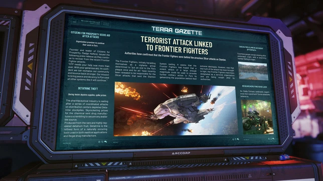 Les Frontier Fighters, qui se présentaient initialement comme un groupe d’autodéfense déterminé à “mettre un terme au fléau de Pyro une bonne fois pour toutes”, ont récemment été reconnus responsables des attaques des Slicer ayant secoué le système Stanton. Il semble qu’ils espéraient provoquer une nouvelle intervention militaire dans Pyro en galvanisant la population derrière leurs idéologies extrêmes grâce à une attaque de grande envergure. Cependant, maintenant que la vérité sur l’attaque a éclaté au grand jour, les Frontier Fighters ont été désignés comme organisation terroriste et sont actuellement recherchés par les autorités.