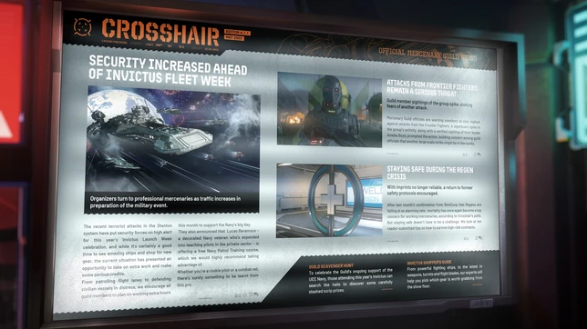 Les récentes attaques terroristes dans le système Stanton ont mis les forces de sécurité en état d’alerte maximale pour les célébrations de l’Invictus Launch Week de cette année. Bien que ce soit assurément le moment idéal pour admirer des vaisseaux exceptionnels et acheter de nouveaux équipements, la situation actuelle offre également l'occasion d'effectuer des missions supplémentaires et de gagner davantage de crédits. Qu'il s'agisse de patrouiller dans les couloirs aérospatiaux ou de défendre des vaisseaux civils en détresse, nous encourageons tous les membres de la Guilde à prévoir des heures supplémentaires ce mois-ci afin de soutenir la Navy lors de ce grand événement.