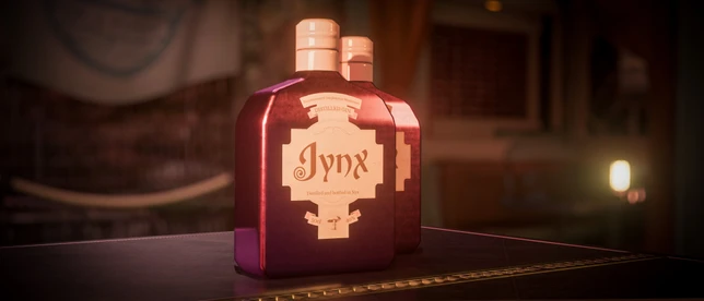 Distillé et mis en bouteille sur Delemar, le Jynx Gin doit sa teinte saisissante et une partie de sa mystique au champignon omphalotus. Créé en 2901 par Alta Turei, barman et légende locale, le Jynx est né d’une expérience visant à produire une boisson à partir d’ingrédients propres au terrain hostile de Delamar. Après nombre d’infructueuses tentatives, Turei fit la découverte révolutionnaire de l’omphalotus, donnant naissance à un gin d’un rose pâle phosphorescent et au goût de rébellion en bouteille.