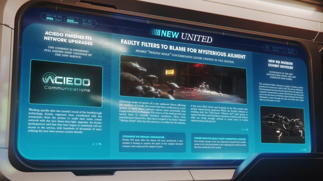 Après plusieurs semaines de signalements concernant une maladie inconnue qui touche les habitants de Levski, la cause en a été identifiée comme une nouvelle espèce de moisissure dont les spores aéroportées provoquent des infections fongiques potentiellement fatales chez l’être humain. L’origine de la prolifération a été retracée dans des filtres de ventilation défectueux récemment installés par le fabricant Gyson Inc. Baptisée “moisissure Molina” du nom de sa première victime, elle a depuis saturé les cliniques et hôpitaux du système Nyx de patients présentant ses symptômes. Alors que l’Alliance du peuple travaille avec le groupe d’aide humanitaire “Alliance Aid”, basé dans l’UEE, pour remplacer les filtres et distribuer des traitements, il est fortement conseillé aux habitants comme aux visiteurs d’éviter les zones de Levski touchées par cette moisissure.
