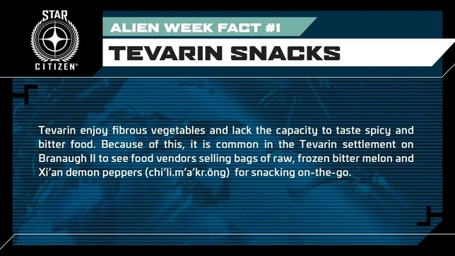Les Tevarins apprécient les légumes fibreux et n’ont pas la capacité de goûter les aliments épicés et amers. C’est pourquoi il est courant, dans la colonie tevarine sur Branaugh II, de voir des vendeurs de nourriture vendre des sacs de melon amer cru et congelé et de piments démons xi’ans (chi’li.m’a’kr.ōng) pour des collations sur le pouce.