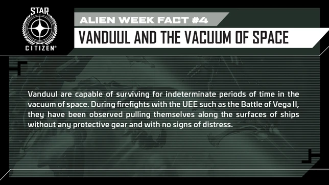 Les Vanduuls sont capables de survivre pendant une période indéterminée dans le vide spatial. Au cours d’affrontements avec l’UEE tels que la bataille de Vega II, ils ont été observés en train de parcourir la surface de vaisseaux sans le moindre équipement protecteur ni signe de détresse.