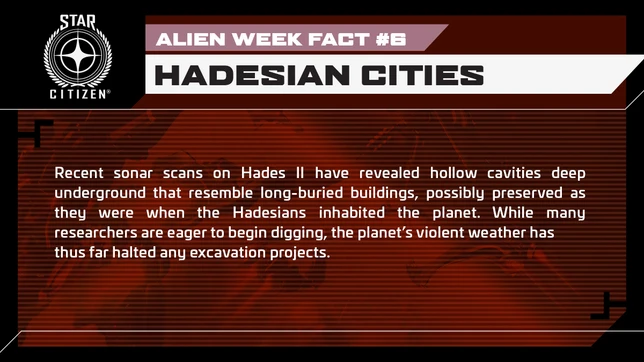 De récents balayages au sonar sur Hadès II ont révélé la présence de cavités souterraines en profondeur s’apparentant à des bâtiments enfouis depuis longtemps, probablement intacts depuis l’époque où les Hadésiens peuplaient la planète. Bien que de nombreux chercheurs soient pressés de commencer les fouilles, le climat hostile de la planète a toutefois stoppé net tout projet d’excavation.