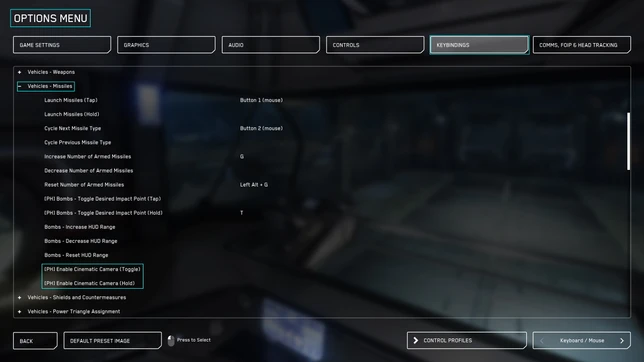 Nous faisons également revenir une fonctionnalité qui a manqué à de nombreux créateurs de machinimas ces derniers temps. Allez dans le menu des options, sélectionnez “Keybindings”, et ouvrez l’onglet “Vehicle – Missiles”. La caméra cinématique pour missiles n’est pas assignée à une touche par défaut. Cependant, vous pouvez maintenant facilement réintégrer ce mode de caméra épique dans votre boîte à outils cinématographique. Nous avons également attaché une caméra cinématique aux bombes. 😉