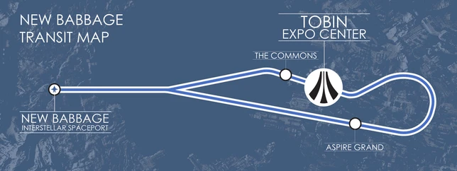 D’abord, vous devez vous rendre sur la planète microTech. Si c’est votre première visite dans le système Stanton, vous pouvez choisir d’atterrir directement au bâtiment Aspire Grand de New Babbage. Si vous êtes déjà un citoyen du ‘verse, faites un saut vers New Babbage, puis atterrissez au spatioport interstellaire. De là, prenez le système de transport Metro et descendez au Centre d’exposition Tobin. Comme ci-dessous, peu importe où vous montez dans le train, vous finirez par arriver au bon arrêt.