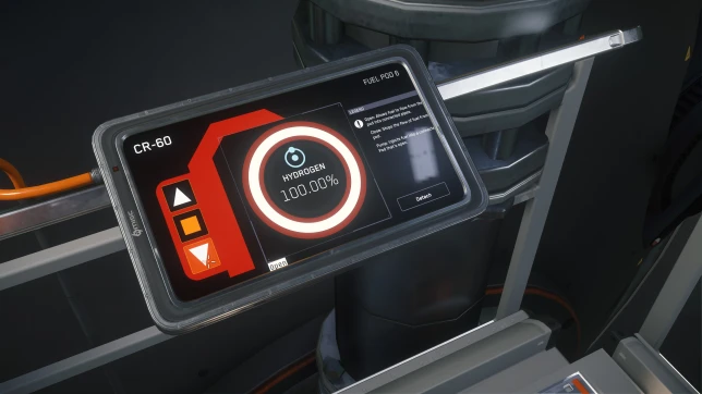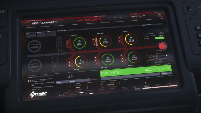 Vous pouvez également réaffecter le carburant entre vos nacelles s’il y a de l’espace libre pour le faire. Ces commandes se trouvent sur la console de ravitaillement sur la passerelle du vaisseau, sous “Pod Management” (Gestion des nacelles), ou vous pouvez vous rendre sur la passerelle arrière et utiliser l’interface individuelle de chaque nacelle. Appuyez sur “Pump” sur une nacelle que vous souhaitez remplir, et sur “Open” sur celle que vous souhaitez vider. Le Starfarer déplacera automatiquement le carburant entre ces nacelles.