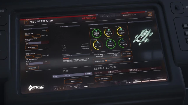 Une fois que vos prix sont fixés et que vous êtes prêt à commencer le ravitaillement, vous devez ouvrir les nacelles de carburant. Vous pouvez le faire en appuyant sur le bouton “Pod Management” (Gestion des nacelles) de l’écran de ravitaillement, illustré ici, ou un membre de votre équipage peut le faire à partir des écrans de la passerelle arrière du Starfarer.