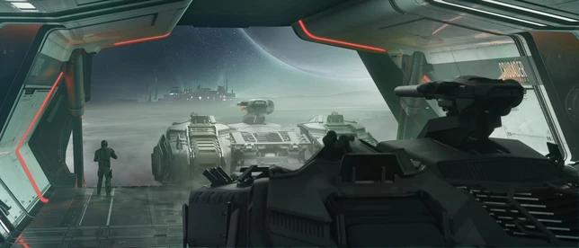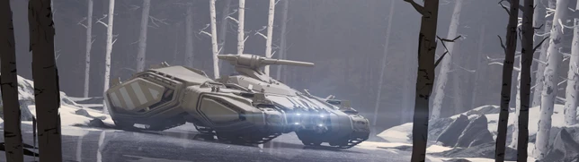 Il y a un espace de rangement pour les armes personnelles dans l’un des logements de la chenille avant et un espace d’inventaire près de l’entrée du conducteur. L’arrière du châssis contient des composants critiques, notamment le moteur, le refroidisseur et le générateur de bouclier, tandis que l’autre chenille avant abrite des composants moins critiques, tels que le radar, l’ordinateur et la batterie.